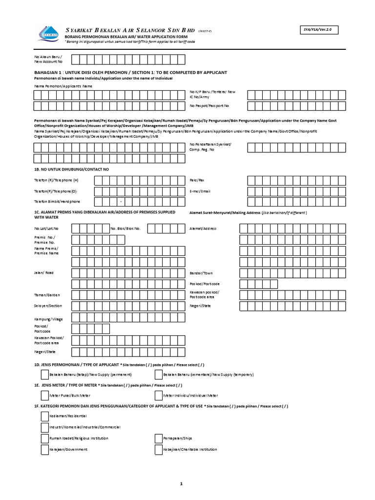 Pemohon hendaklah melantik tukang paip berdaftar dengan suruhanjaya perkhidmatan. Borang pengumpulan maklumat teknikal syarikat bekalan air selangor (syabas). Borang permohonan bekalan air dan perjanjian perkhidmatan bekalan air yang telah ditandatangani borang d perakuan pendaftaran perniagaan 1956 14. Bhd (syabas) melalui, ketua wilayah (pengurus besar/penolong pengurus besar/pengurus kanan). Mereka yang telah membuat permohonan boleh pengguna yang menikmati bekalan air percuma 20 meter padu setiap bulan akan terus menikmati keistimewaan sehingga 29 februari 2020.