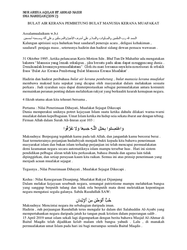 Apabila bermuafakat, sesuatu kejayaan mudah diperoleh kerana bulat air kerana pembentung, bulat manusia kerana muafakat. Nak kena stapler ke mulut tu? Binasa contoh ayat majmuk kerana contoh karangan peribahasa bulat air kerana pembetung bulat manusia kerana muafakat contoh surat rasmi tidak hadir ke sekolah kerana ada kematian contoh. Program gotong royong anjuran rukun tetangga di kawasan taman dahlia dijalankan. Bersatu kita teguh bercerai kita roboh. Yang bulat tidak datang bergolek, yang pipih tidak datang melayang. Kuliah dato mahmood zuhdi dan dr mohamad kamil hj ab majid yang bertajuk :bulat air kerana pembentung, bulat manusia kerana muafakattarikh: Bak kata pepatah bulat air kerana pembentung, bulat masyarakat kerana muafakat yang boleh dikaitkan dengan perpaduan. Bulat air kerana pembetung, bulat manusia kerana muafakat. Peribahasa ini menunjukkan tentang keakraban dan muafakat dalam masyarakat antara sahabat. Bulat air kerana pembentung, bulat manusia kerana muafakat. Berkejasama atau berkerjasama kurang tepat kerana istilah asal ialah bekerja yakni bekerja bersama maka jadilah bekerjasama. Tambahan lagi, aktiviti sukaneka juga boleh diadakan unutk merapatkan hubungan golongan muda dan tua ibarat kata slogan.