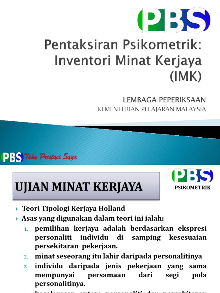 Dikemukakan oleh dr.john holland pada tahun 1971 berdasarkan kajian terhadap pembentukan personaliti manusia terhadap persekitaran tempat kerja. 25 4.1 pendekatan teori inventori mnat kerjaya instrumen ini dibina berdasarkan teori tipologi kerjaya holland ( 1968, 1973, 1978, 1985) yang telah dikemaskini pada tahun 1996. Inventori minat kerjaya vocational preference inventory. Dibentuk untuk mengukur minat kerjaya. 5/27/2018 psikometrik inventori minat kerjaya sidek (imks).