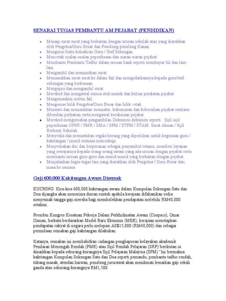 Keterangan Tugas Kerani Akaun from imgv2-1-f.scribdassets.com Kerani am pejabat menjalankan pelbagai tugas yang telah dikelaskan dalam mana mana pekerjaan perkeranian pejabat yang khusus dan memerlukan pengetahuan yang terhad dalam sistem dan prosedur pengurusan pejabat. Kerani am pejabat melaksanakan pelbagai tugas perkeranian dan pentadbiran menurut prosedur yang ditetapkan. Senarai tugas setiausaha pejabat gred n29 beserta gaji.sekiranya anda adalah lepasan diploma / stp/ stpm/ stam/ hsc yang sedang mencari pekerjaan, cubalah memohon jawatan setiausaha pejabat gred n29. Apa bidang tugas kerani am? For more information and source, see on this link : 3.melaksanakan tugas dan tanggungjawab seperti yang disenaraikan oleh kementerian/jabatan di. (b) pemohon mempunyai pengetahuan kerasmian agama islam, June 15 2011 june 15 2011 ciktom 36 comments apa bidang tugas kerani am bidang kerja kerani admin.